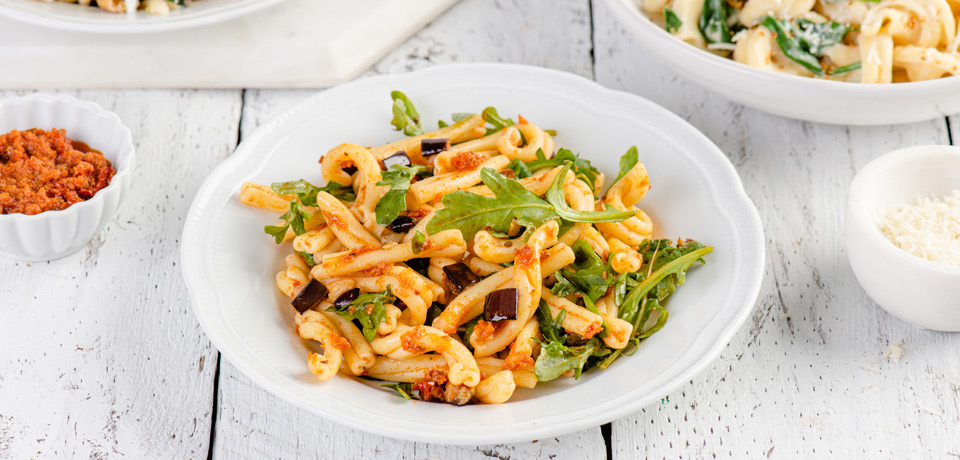 Casarecce are short twists of pasta rolled in on themselves making them perfect vessels for capturing thinner sauces or gathering pools of melted cheese. With its Southern Italian origins, this pasta pairs well with ingredients like eggplant, tomato and basil.