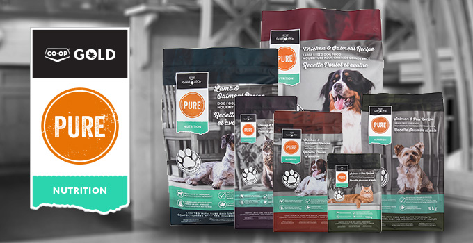 CO-OP GOLD PURE® Pet Food is made by us with our best friends in mind. Produced in Canada with real meat as the number one ingredient, our premium quality pet food has all of the nutrition your animal needs. The ingredients have been locally sourced from sustainable sources where possible.