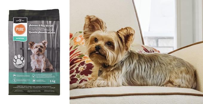 Adorable Wazzy, a six-year-old Yorkshire terrier who loves belly rubs, fetch, sunbathing and relaxing, is the poster pup on the grain-free Salmon and Pea bag. Since joining Elaine’s family, Wazzy has accidentally locked them out of their vehicle not once, but twice.