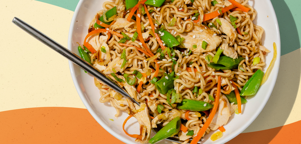 Or try an Asian twist by stir-frying sliced cooked chicken with carrots and snap peas (or whatever veggies you have on hand), ramen noodles and your favourite bottled sauce like Co-op Gold Honey Garlic or Sweet Teriyaki Sauce.