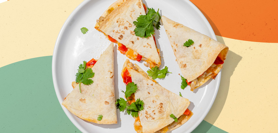 Quesadillas are easy to customize. Place some sliced chicken breast on half a large flour tortilla, top with Co-op GOLD Tex-Mex Shredded Cheese, fold in half, place on a cookie sheet and bake at 350 °F (177 °C).