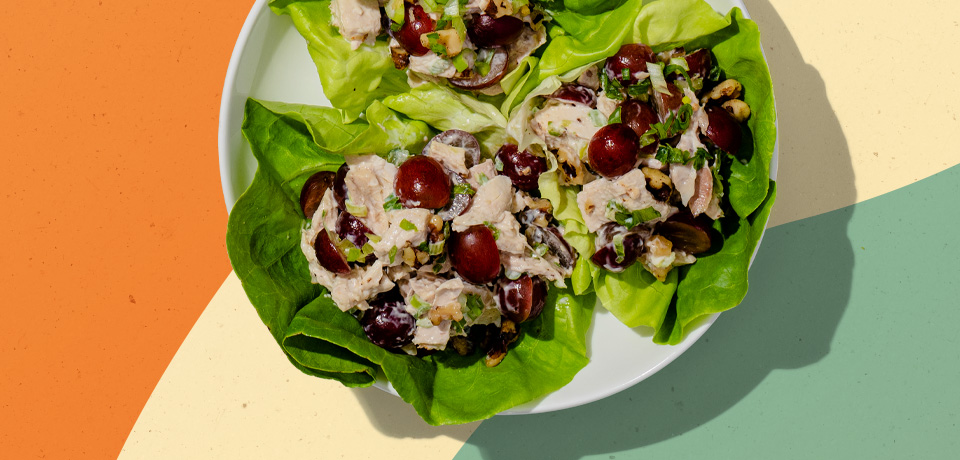 Dress up chicken salad, Waldorf style – chop two cups of a mix of white and dark meat, add a quarter cup of mayonnaise, two tablespoons of sliced green onion, a half cup of your choice of chopped fruit (grapes, apple, pear), and a quarter cup of whatever seeds or chopped, toasted nuts you have available. Walnuts are classic, but pecans or sunflower seeds also work great.