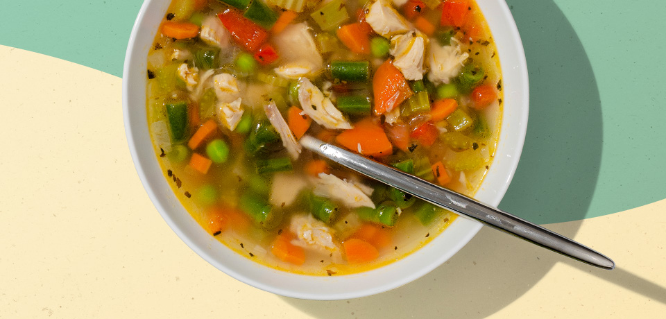 Once the carcass has cooled, pick any remaining meat from the carcass and chop. Put the reserved broth back on the stove, add chopped vegetables like onion, garlic, celery, carrot, peppers, peas or beans, simmer for 15 minutes until they’re cooked, add chopped meat to the broth, and season to taste.