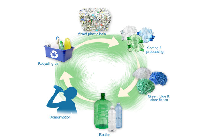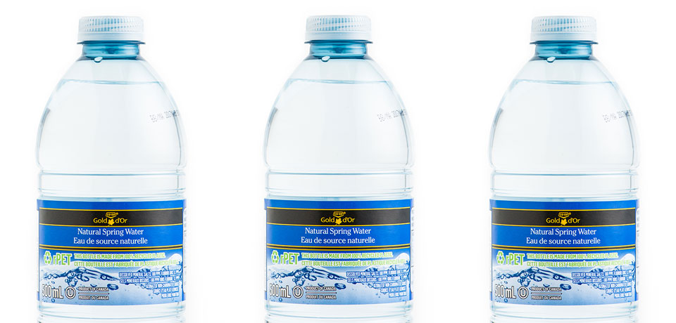 The blue-tinted bottles – recycled polyethylene terephthalate (rPET) to be specific – are produced and filled in Western Canada. Recycled bottles are sorted by colour, shredded into flakes to create resins which are then used to create new bottles.