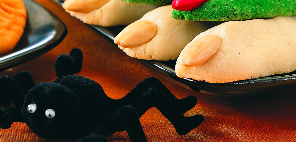 Add ground almonds. Mix well. Divide dough into eight equal portions. Divide each portion into six pieces. Shape each piece into three-inch long log or finger. Arrange about two inches apart on greased cookie sheets. Squeeze each finger in centre to form knuckle. Press one whole almond on one end of each finger to form nail. Bake in 350º F (175º C) oven for 10 to 13 minutes until firm. Let stand on cookie sheets for five minutes before removing to wire racks to cool.