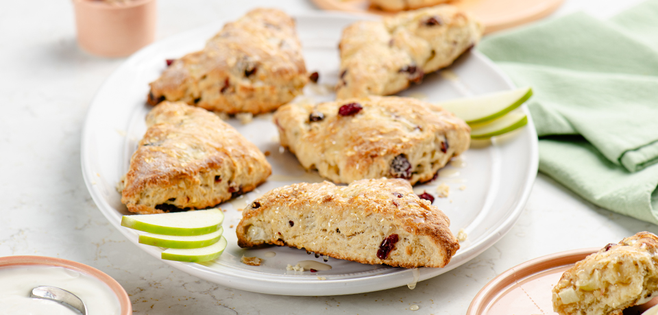 - In a separate bowl, mix cranberries, apple, applesauce, egg and vanilla. Add to the flour mixture. Mix it just enough to bring it together. You want to mix it but work it as little as possible to help it to become a flaky scone.