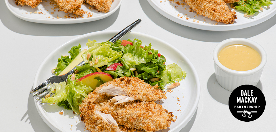 - Cut the chicken breasts into strips lengthwise, getting four strips from each breast. Season the strips with salt and add to the bowl with the egg mix so they are evenly coated. You can leave the chicken to marinate, or bread it right away.