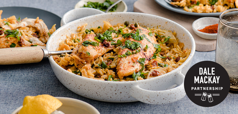 - Cut chicken breast in half, lengthwise and toss in a bowl with oil and paprika. Place chicken cut side down onto orzo mix.