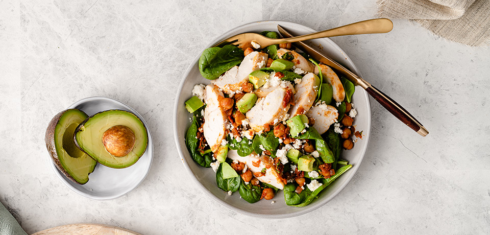 - Divide spinach among four plates. Top with chickpeas, chicken breast, avocado and a sprinkle of feta cheese.
