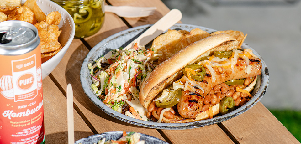 - To serve, place a sausage in a bun and add beans, pickled jalapeños and cheese. Serve with slaw on the side or on top.
