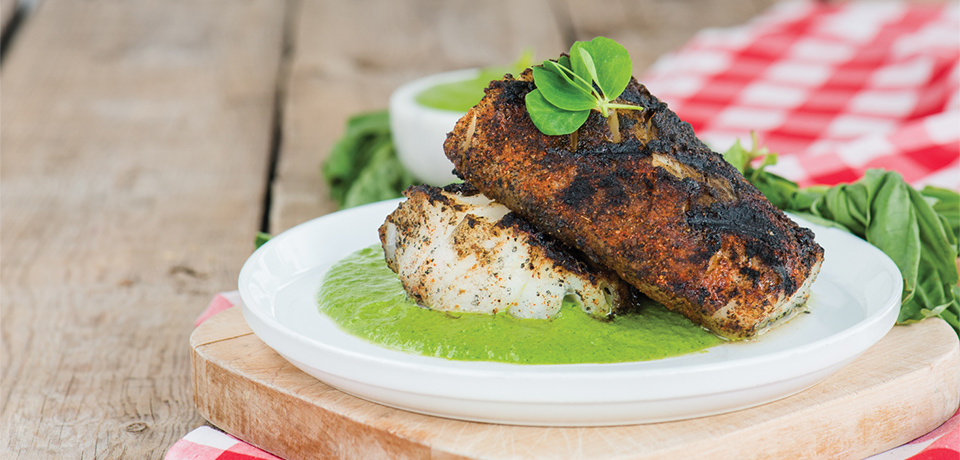 Prepare the salsa verde in a blender by puréeing garlic, salt, capers, Dijon, red wine vinegar and olive oil. Add basil, mint and parsley, then lightly pulse until the herbs are chopped and combined, but not puréed. Dredge the fish in your favourite blackening or Cajun spice and grill or bake until an internal temperature of 70° C (158° F) is reached. Plate with the bright, flavourful salsa verde and enjoy!