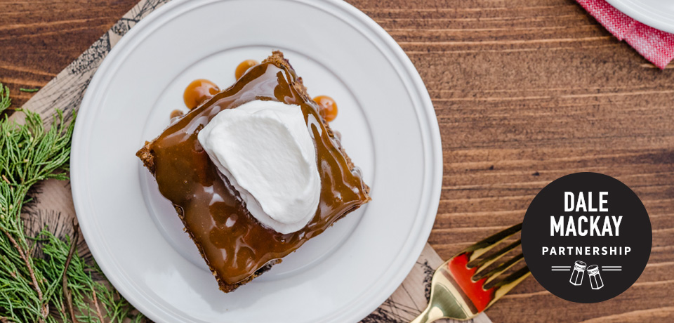 To serve, warm cake, generously coat with toffee sauce and top with a spoonful of whipped cream. Enjoy!