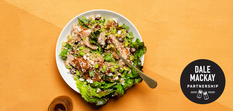 With a sharp knife, cut root and core out of the Red Batavia greens. Tear lettuce into large pieces and place in a large mixing bowl. Add remaining salad ingredients, cooled quinoa and chicken. Pour desired amount of dressing over and toss to combine.