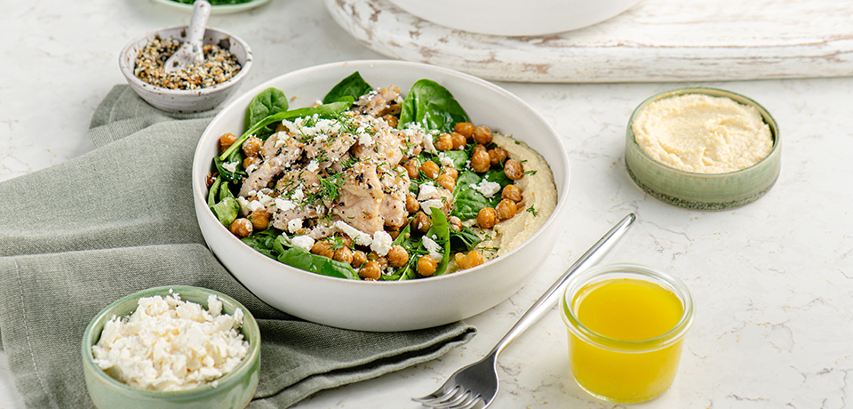 - To build your bowls: Add hummus on the bottom of your bowls, followed by chickpeas, spinach, chicken, feta and fresh dill. Drizzle dressing over top and enjoy warm, cold or room temp.