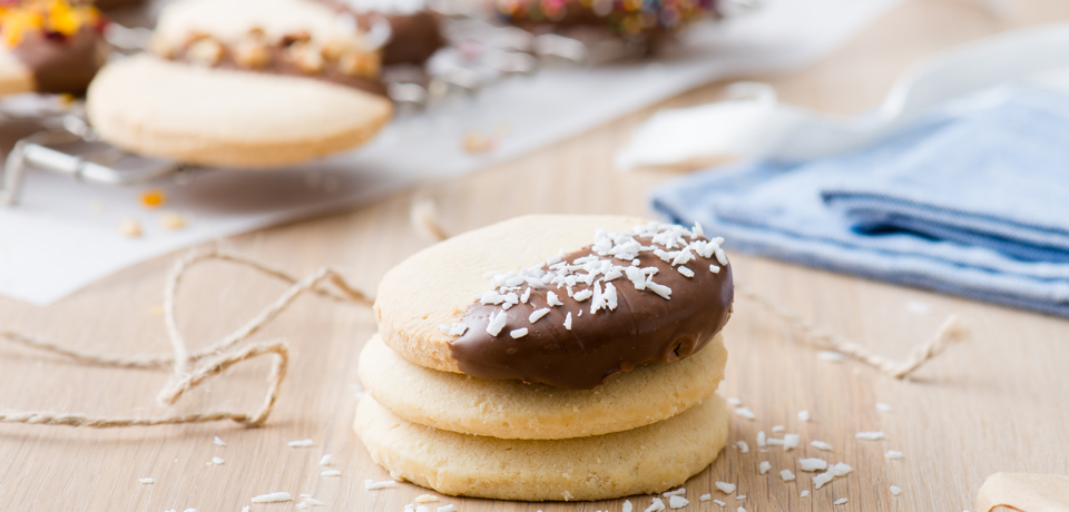Once melted, remove from heat, and dip cookies into melted chocolate, place on a cooling rack, and sprinkle with toppings while chocolate is still warm.