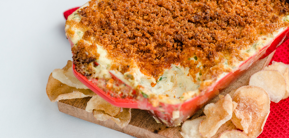 In a small bowl, combine breadcrumbs, butter and spices. Sprinkle the crumbs over the mix and bake in oven until hot, and crust has crisped and lightly browned, approximately 15 minutes.