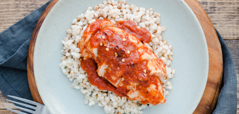 Remove chicken from marinade. Grill over medium-high heat until charred and cooked through, approximately 20 minutes. Alternatively, bake the chicken in a 375° F oven until the internal temperature reaches 165° F, approximately 15-18 minutes. Serve over hot barley and drizzle with olive oil. Serves four.