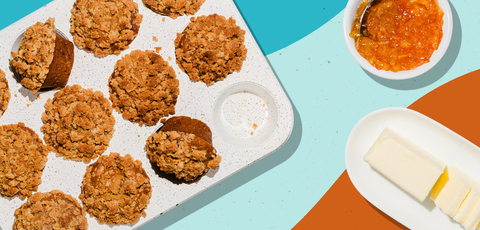 - Evenly distribute muffin mix into the prepared pan and top with the crumble.