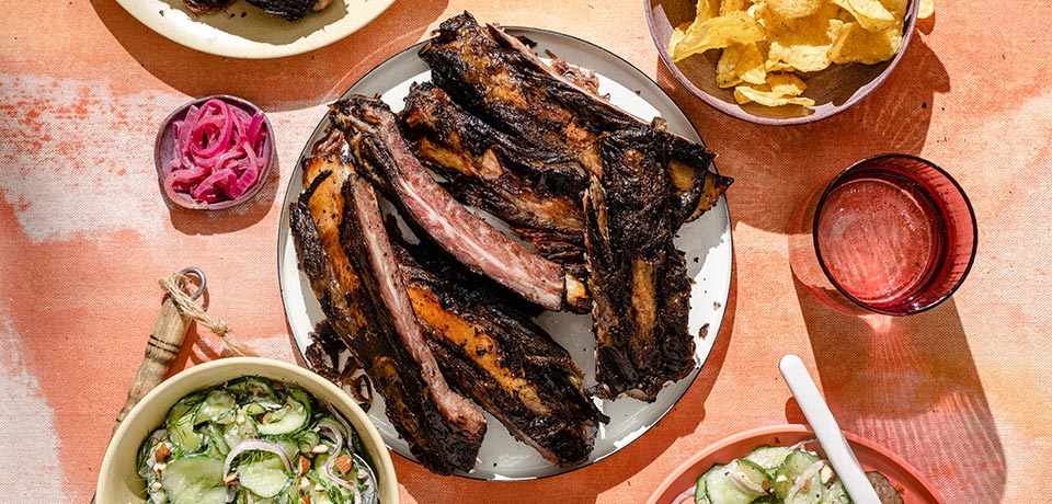 - Remove ribs from grill and cover lightly with foil while they rest for 30 minutes. Cut between bones and serve with cucumber salad.
