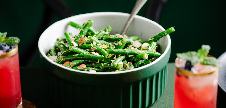 Bring a large pot of salted water to a rapid boil and fill a large bowl with ice water. Blanch the green beans in the boiling water for approximately a minute, or until just lightly cooked but still with a pleasant bite. Transfer the beans to the ice water to halt cooking. When the beans are chilled, remove from ice bath and drain thoroughly.
