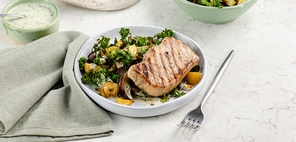• To plate, split your potatoes between two plates. Drizzle green goddess sauce over top of the potatoes. Place pork on top and enjoy.