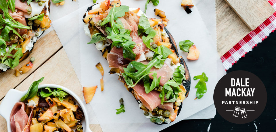 Cut peaches in half and remove pit. Gently toss peaches, ginger, sugar and lime juice together in a medium bowl and marinate for at least 30 minutes. Preheat grill to medium heat. Place peaches cut side down, turning as char marks appear – about three minutes per side. Remove from heat just before they start to soften, as they will continue to cook once removed from the grill. Let cool and roughly chop. Set aside until ready to assemble.