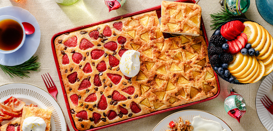 - Line a 9 by 13-inch sheet tray with parchment paper. Spread batter on the sheet tray. Evenly distribute strawberries and chocolate chips on half of the batter. On the other half, evenly arrange pineapple pieces, then sprinkle with brown sugar.
