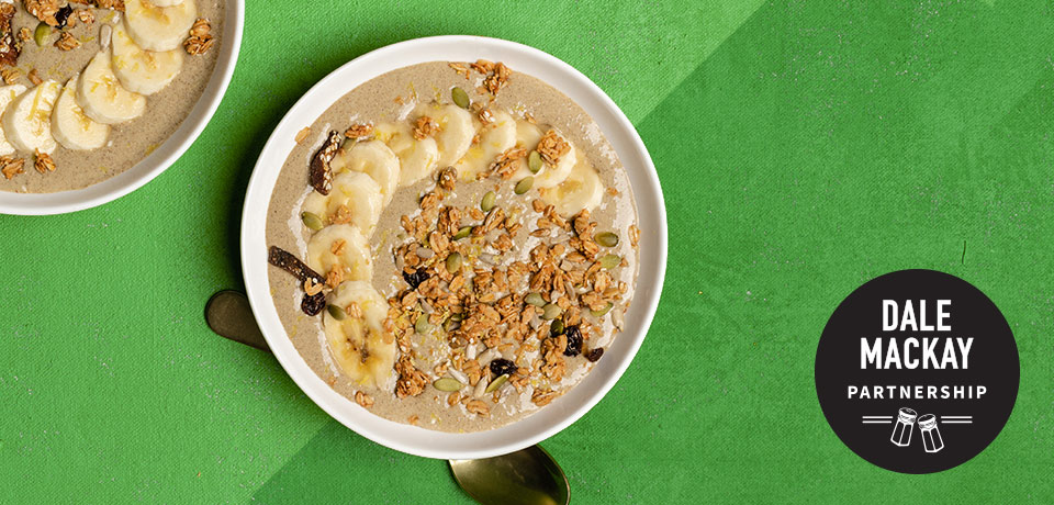 Pour mixture into two bowls. Top with granola, sliced banana and lemon zest.