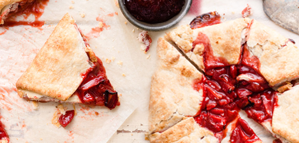 Once the dough is thoroughly chilled, roll into a rough circle on a lightly floured surface to a 1/8” thickness. Transfer the dough to a parchment-lined baking sheet. Mound the strawberry mixture into the centre of the circle, and working clockwise, fold the dough over it. Leave a 4” gap in the centre to create a rustic shell. Pinch the dough at points of overlap to ensure that it stays put. This will also help ensure even baking of the pastry. Place the unbaked crostata in the freezer for 10 minutes to give the pastry a chance to firm up.