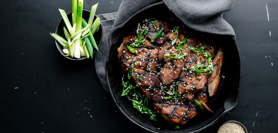 To serve, slice steak and sprinkle with green onions and sesame seeds. Serves four.