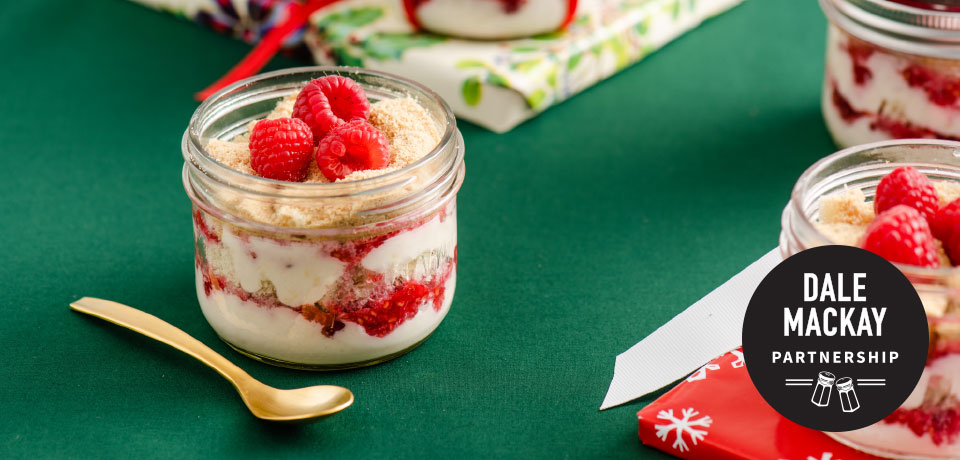 To assemble each jar, layer a small amount of the cream mix, jam, a few fresh raspberries and then cubed cake. Repeat until full. The more layered the better! Top with one tablespoon of graham cracker crumbs and fresh raspberries. Repeat for remaining jars. Serve chilled or at room temperature.