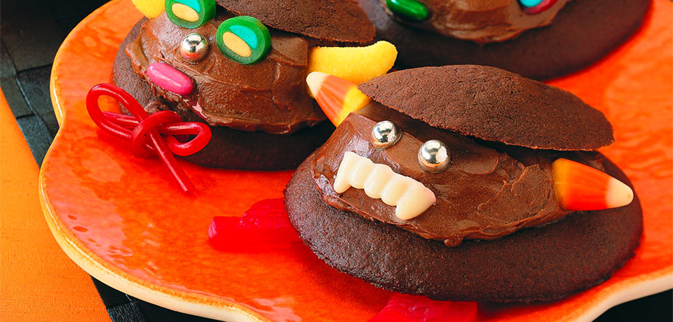 In a separate bowl, beat dessert topping, pudding powder and cold milk for about five minutes until spreading consistency. Makes 2 ⅔ cups filling. Slice each cookie in half horizontally. Spread two tablespoons filling on bottom half of each cookie. Cover with top halves. Press each cookie gently until a small amount of filling oozes out between layers. Press candies into filling to create “monster” faces.