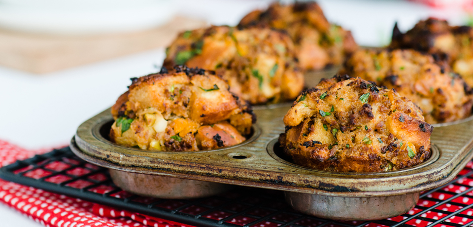 Transfer the mixture to a large mixing bowl. Add the bread cubes, sage, parsley and remaining chicken stock to the cooked mixture. Gently stir to combine and moisten the stuffing. When the mixture is evenly combined, mound the mixture in lined or lightly greased muffin tins.