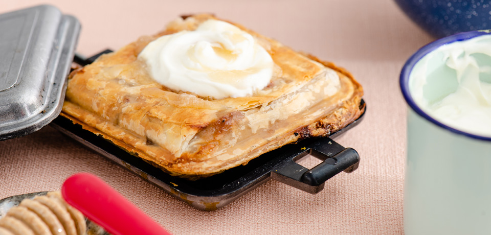 - Place bush pie pan six inches above hot coals over camp fire for about five minutes on each side, or until pie is golden brown. After both sides are browned, carefully remove pie from pan and allow to cool for at least five minutes before eating. Serve with sour cream and honey.