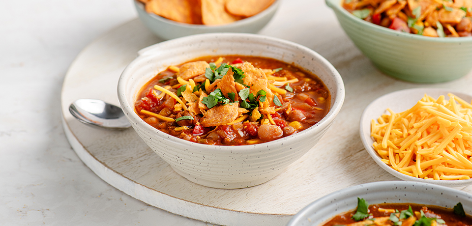 - To serve, ladle into a bowl and garnish with cheddar flavoured shreds, tortilla chips and/or cilantro. Serve a lime wedge on the side and add as you like.