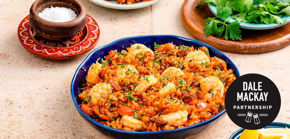 After 15 minutes, stir in remaining ½ cup of tomato-clam juice and lightly push prawns into the rice. Transfer the pan to oven and bake for six to eight minutes, until top of rice is crispy and remaining juice is absorbed.