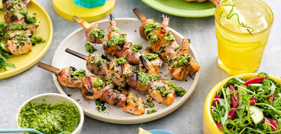 - To cook skewers, turn on BBQ to high. Brush each kebab very lightly with canola oil. Grill each side of the kebabs approximately 3 minutes, then flip and cook for 3 minutes or until prawn is completely pink. Squeeze the reserved lemon juice over the skewers. Serve with arugula pesto.