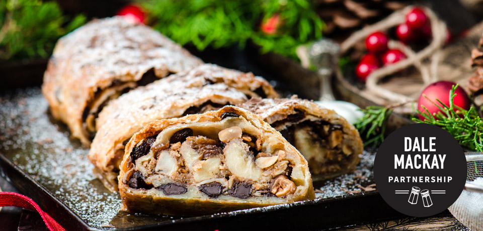 Lightly flour work counter and lay out the puff pastry. Rub the remaining ¼ cup of butter evenly across the centre of the pastry, leaving a 2 inch border around the edges. Sprinkle sugar, chocolate chips, raisins, cinnamon, and toasted oats and hazelnuts evenly over the butter. Slice bananas lengthwise and place at one edge of the butter border.