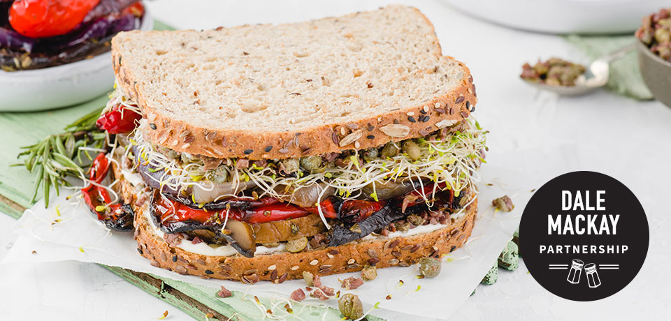 Spread tapenade and mayonnaise on both the top and bottom slices of bread. Build sandwich with roasted vegetables and alfalfa sprouts and enjoy. This delicious sandwich can be served slightly warm or cold.