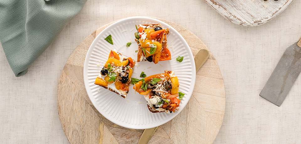 - Divide Siggi’s Skyr evenly on the two pieces of bread. Top with pepper mixture. Cut each half into 4 pieces. Garnish with Parmesan. Serve warm or at room temperature.