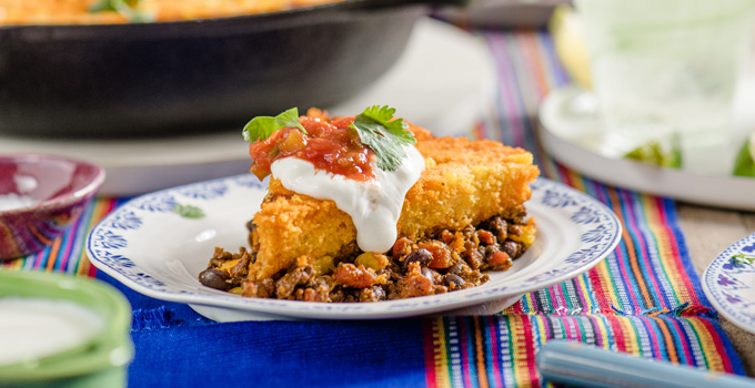 - In a large bowl, stir cornmeal, flour and a quarter cup of corn together. Add butter, cheese, broth, baking powder and salt and mix well. Let batter sit for three to five minutes to allow moisture to absorb. Spoon an even layer over meat filling, making sure the mixture is entirely covered, then sprinkle remaining corn over top.