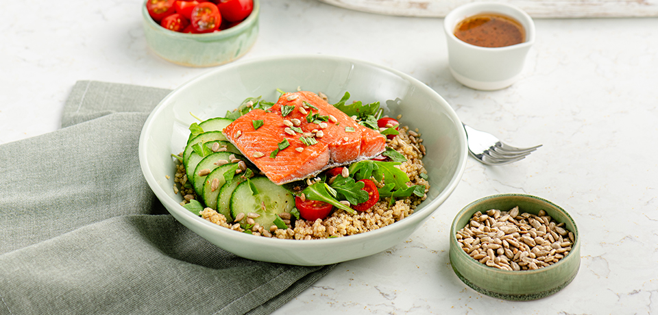 • To build your bowl, place ⅔ cup of cooked quinoa on the bottom of each bowl. Next, add your cucumber, tomatoes and arugula. Season with salt and drizzle dressing over top. Slice salmon into individual portions and add to bowl. Top with basil and sunflower seeds. Enjoy warm, room temperature or cold.
