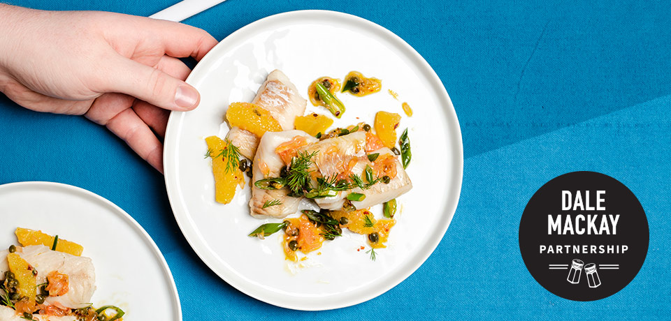 Cut walleye into four-inch lengths and place on parchment paper-lined baking tray. Drizzle fish with one tablespoon olive oil and salt and bake at 350°F for eight to 10 minutes. When cooked, let fish rest for about five minutes to cool slightly.