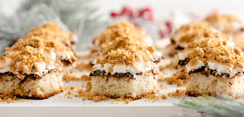 - After brownie has fully cooled, remove from fridge, and spread the ganache over brownie base. Chill in fridge. Spread the marshmallows over the top, and use a blowtorch or broiler to brown the marshmallows.