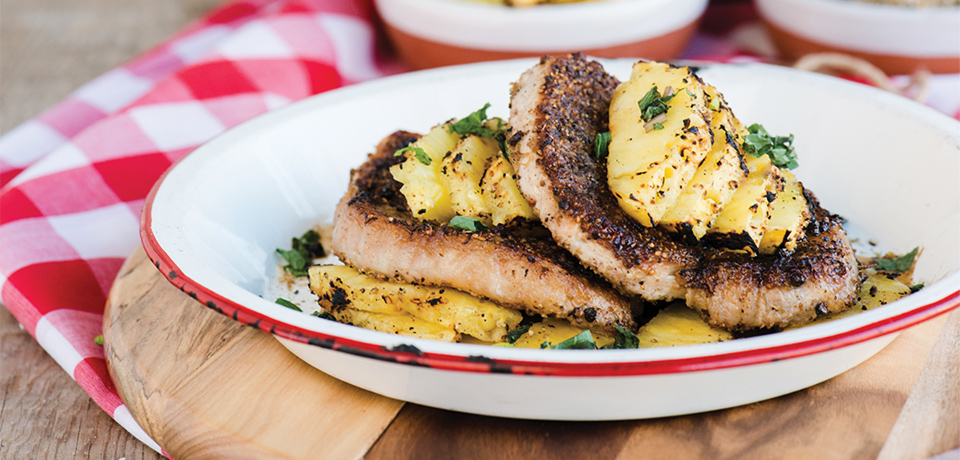 While the chops are resting, turn grill to high heat. Sprinkle the pineapple with reserved spice mixture and grill on high until caramelized on one side, turn over and grill lightly. Slice pineapple and serve on top of spiced pork and finish with a sprinkling of fresh mint.