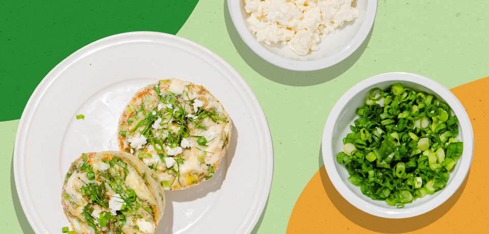 - Evenly layer the spinach, green onion, feta cheese and cottage cheese into the muffin pan.