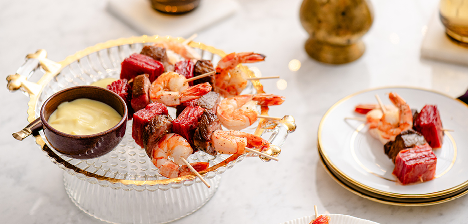- Carve steak against the grain, place a prawn, followed by a slice of steak, and your cube of pavé onto a toothpick. Sprinkle hollandaise with paprika and serve as a dipping sauce on the side, or spread on a plate and place your appetizer on top.