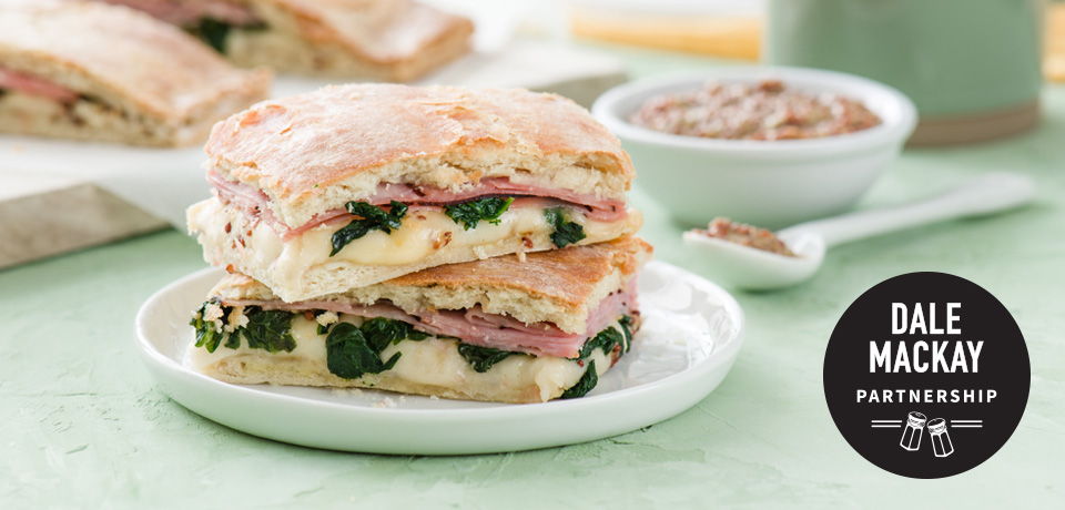 Spread mustard over one section of dough, leaving about a half-inch border around the edge. Next, evenly place cheese, spinach and ham on the dough. Take the other section of rolled-out dough and carefully place on top. Pinch together all the edges to ensure it is well sealed. Place in the fridge or freezer for about an hour to allow the butter to harden. This is an important step as it ensures nice flaky biscuits.