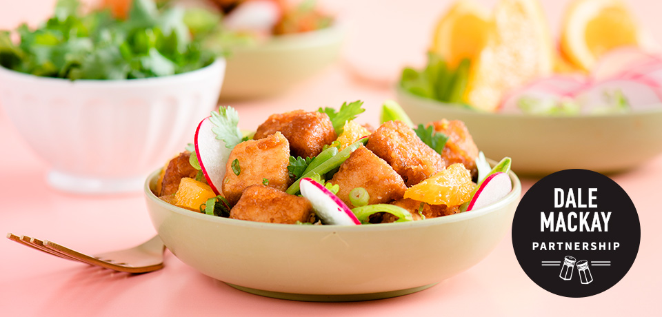 In a small bowl, mix reserved marinade, orange zest and sesame oil. Add the dressing to the tofu. Mix in snap peas, radishes, green onions, orange segments and fresh cilantro. Toss lightly until mixed.