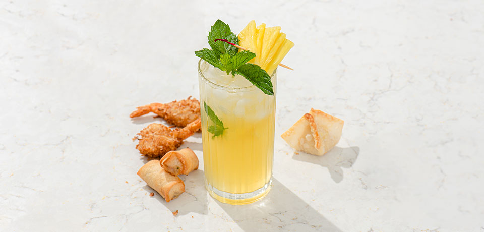 - To make the cocktail, pour rum into a tall glass. Fill one-quarter full with ice.